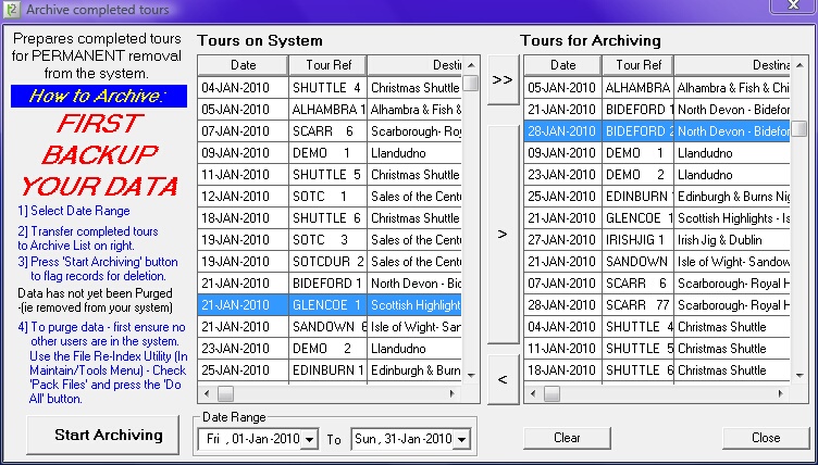 Before you even contemplate removing completed tours, ensure that you have taken a full backup of your tours data for PERMANENT storage and that you have printed out all the reports you are likely to require for the period you intend to archive. A Data Snapshot helps here in that if anything reports have been missed, all is not lost.
